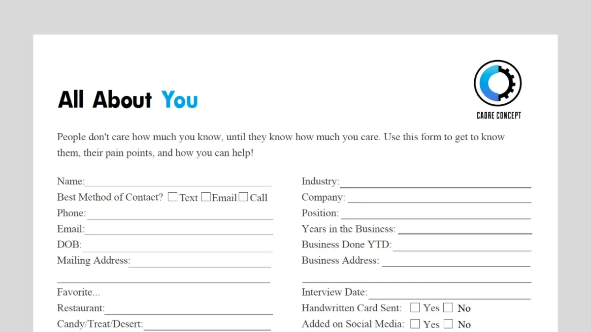 This form provides you with the framework you need to interview people, and find the right business professionals to join your Cadre.