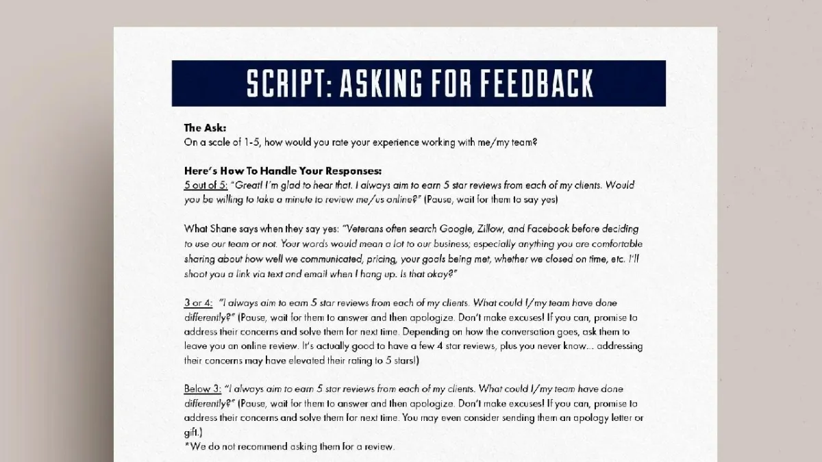 One of the most critical ways to score a proactive point with your clients, this script helps you put their feelings into words. From turning negative feedback into something to work on to turn satisfied clients into online reviewers, this resource will help you frame your relationships.