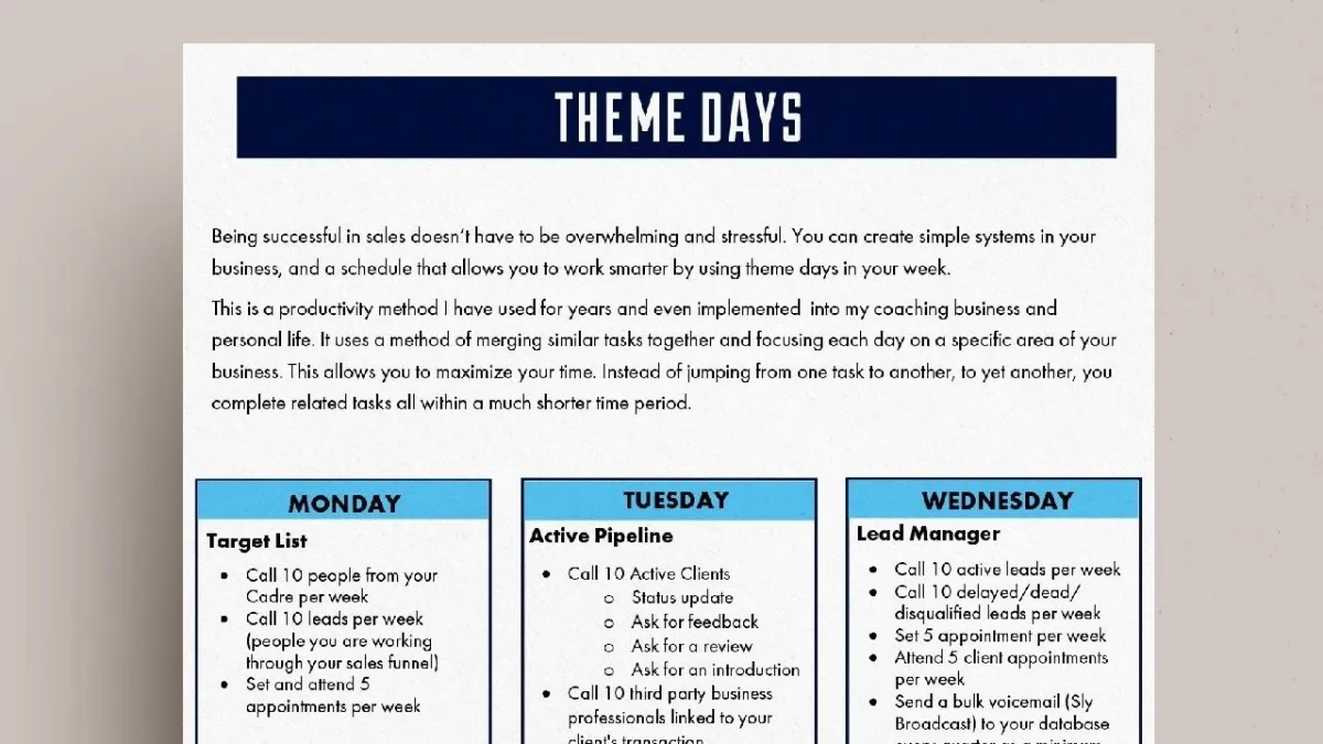 Maximize your time by using this method of merging similar tasks together and focusing each day on a specific area of your business.