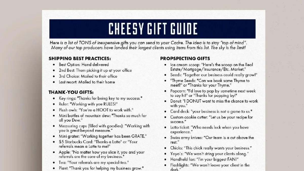 Stay top-of-mind with your potential clients by using this resource full of inexpensive gift ideas. Have fun with this - the sky is the limit!
